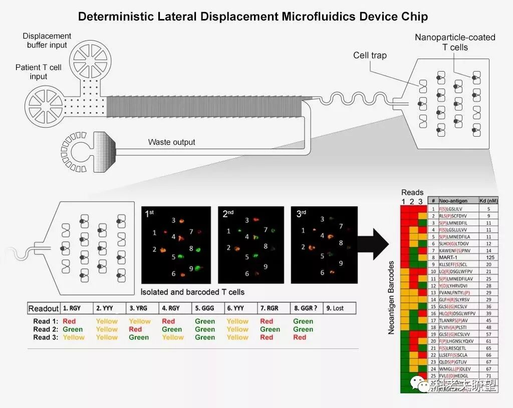 在imPACT技术中,这些肿瘤抗原会被载到通过”DNA条形码”标记过的磁纳米颗粒上,每一种肿瘤抗原对应一种条形码。随后,这些磁纳米颗粒被用来富集外周血中能识别对应肿瘤抗原的T细胞。这些被肿瘤抗原富集的T细胞随即会通过一个微流控芯片、被分离为单细胞状态(图2)。通过荧光DNA探针与”DNA条形码”的杂合反应,就能通过荧光显微镜读出每一个T细胞所结合的纳米颗粒上的”DNA条形码”的序列,并据此判断出该T细胞能识别的是哪一种肿瘤抗原。