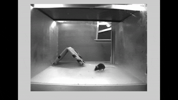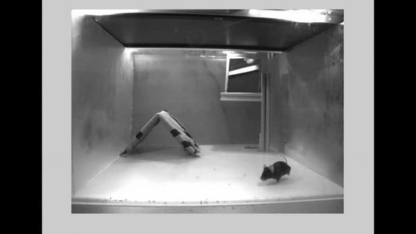 在特制的小鼠房间里,天花板被做成了用来放映光刺激的显示器,房间角落放置着一个避难所,同时墙体里埋藏有一个摄像头暗中观察小鼠的行为。