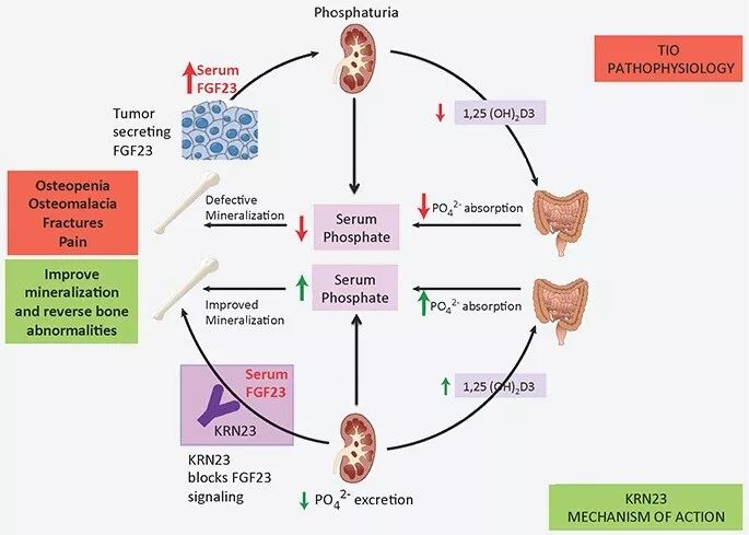 短短六个月之后,这个公司又给将近15000名XLH(X染色体连锁低磷血症)患者带去了新的治疗药物—Crysvita。XLH患者体内一种名为FGF23 (Fibroblast Growth Factor 23)的激素分泌过多,这类荷尔蒙的过剩会导致磷酸盐随尿液排出并且阻碍肾脏内活性维生素D的生成,从而导致严重的骨骼发育异常, 作为一个单抗药物,Crysvita能够结合FGF23,并抑制这一荷尔蒙的活性,从而促进肾脏对磷等重吸收并增加血液的维生素D浓度。这个药物目前还在进行针对另一个病因非常类似的罕见病—肿瘤性软骨症(tumor-induced osteomalacia, TIO)的临床2期实验。