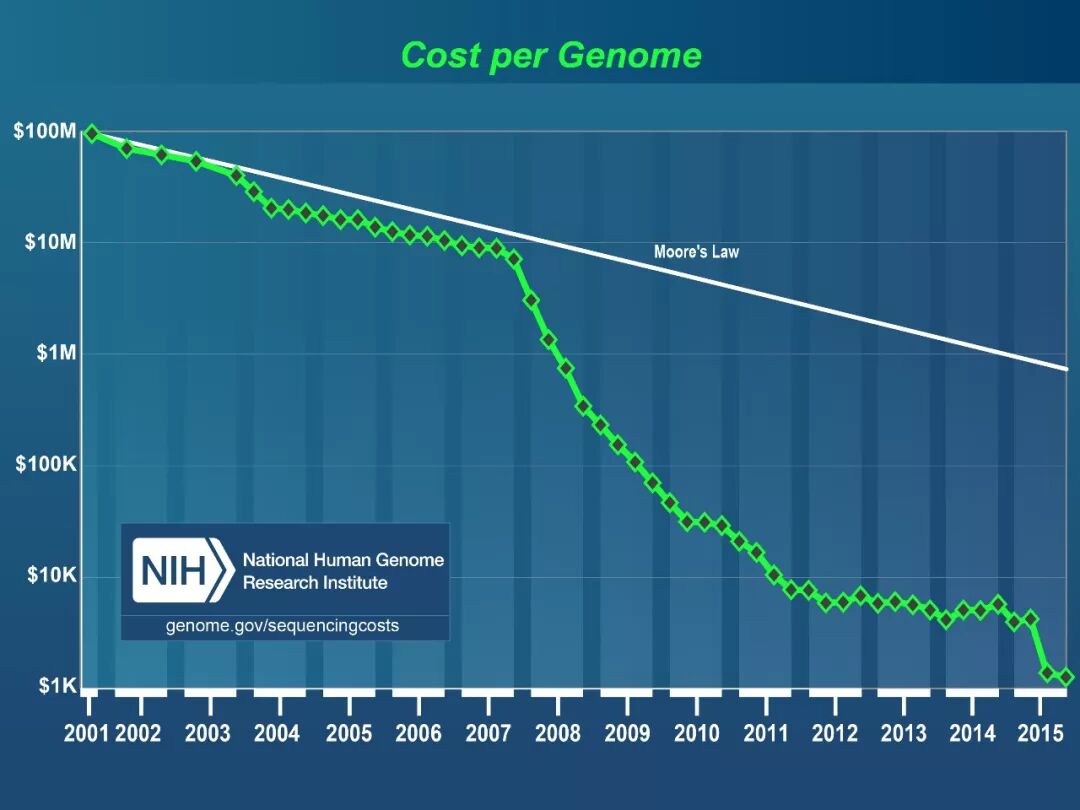 自2007年起,基因组测序成本的降低速度开始远大于摩尔定律,其中Illumina公司的Solexa技术是重要推动力。 (来源:National Human Genome Research Institute, NIH. https://www.genome.gov/27541954/dna-sequencing-costs-data/ )