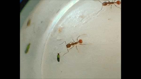 一只正在蚂蚁身上偷偷“揩油”的隐翅虫(注意仔细看它的前肢!)旁边有一只已经“涂了油”的隐翅虫淡定地路过了蚂蚁。图片来源:Parker Lab at Caltech