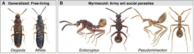 就像电影中时常出现通过变装来蒙混过关的桥段,有些隐翅虫也掌握了“易容术”。Joseph 观察到,有种角隐翅虫(Aleocharinae)长得就特别像他们的共生对象——军团蚁。他观察到,在不同军团蚁大军中存在着与之外形相对应的隐翅虫卧底。这让他感到十分震惊,因为这些卧底们的外形与现生的大部分独立生存的隐翅虫都差异巨大。相比于独立生存的隐翅虫,卧底隐翅虫有着与宿主蚂蚁类似的叶柄状腹部,细长的附肢和膝状触角。