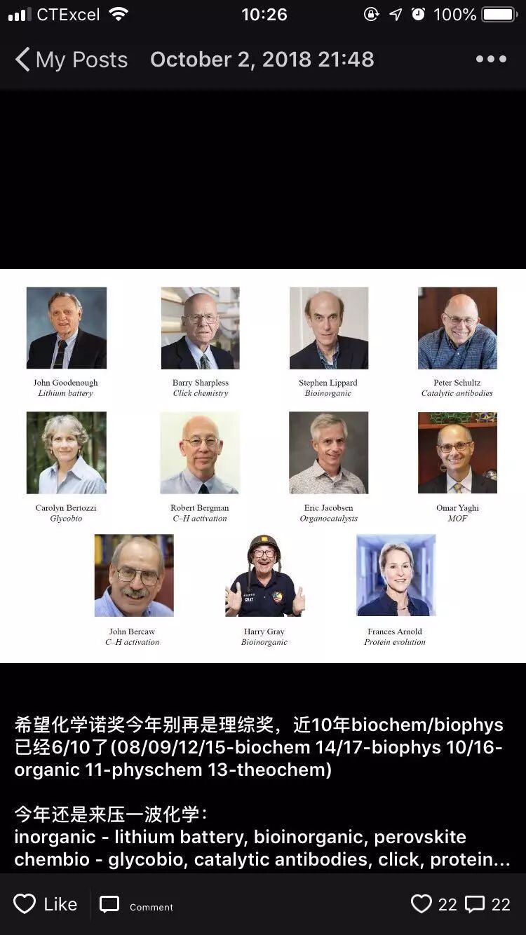 陈凯:虽然一直以来Frances经常被人们猜测有获得诺贝尔奖的可能性,但Frances并未想象到“诺奖”来得如此突然。甚至,在之前聊起诺贝尔化学奖时,Frances仍感叹,不同方向下,有不少先驱前辈值得“诺奖”殊荣却还未得,比如作为加州理工学院生物无机领域的先驱Harry B. Gray,金属有机以及碳氢键活化领域的前辈John E. Bercaw。