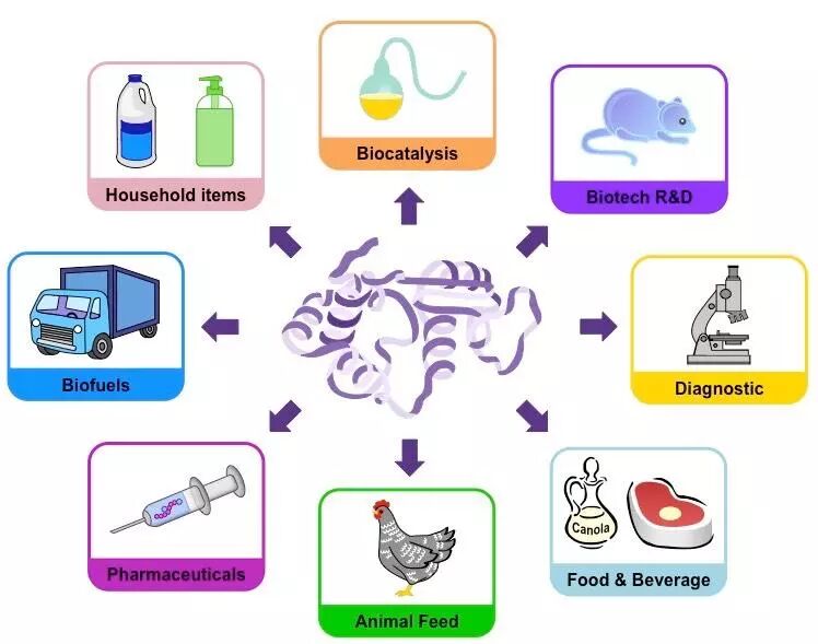 日常用的洗涤剂用酶作为促进剂;食品工业上的发酵、降解等过程酶更是必不可少;药物以及精细化工中,传统化学的一些生产过程需要重金属参与且耗能高,酶作为绿色高效催化剂已经替代了它们。此外,酶更是生物能源发展中最为重要的角色。