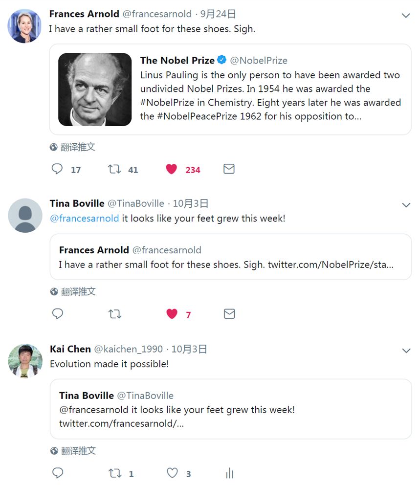 一件有意思的事情是,在诺贝尔化学奖公布的十天前, Nobel Prize的官方twitter曾点评了两次诺奖得主鲍林(Linus Pauling,1954年的化学奖和1962年的和平奖)的生平。Frances作为加州理工学院以鲍林冠名的讲席教授转发了这则twitter并评价,自己的教授头衔虽包含“Linus Pauling”,但与鲍林相比——“I have a rather small foot for these shoes. Sigh.” (“我的脚太小,还没法穿这样的鞋,唉。”意为自己还不够诺贝尔奖这样的级别)。谁知,几天后“诺奖”真的来了,实验室成员便调侃Frances——“@francesarnold it looks like your feet grew this week!” (“Frances, 看来这一个星期你的脚就长够大了”) —— “Evolution made it possible!” (“进化让它成为可能!”)。