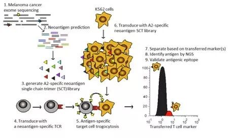 在肿瘤的发生发展过程中,肿瘤细胞会累积基因突变并产生异常蛋白质,这些蛋白质,很有可能会激活免疫系统,并引来免疫系统对癌细胞的攻击。基因组学,蛋白质组学以及生物信息学的高速发展,让研究者可以从癌症患者的肿瘤中快速的鉴定出这些能够被由癌细胞基因突变所产生的异常蛋白质(异常抗原),就是肿瘤新生抗原(Neoantigen)。由于这新生抗原具有肿瘤特异性,因此靶向这些抗原的免疫治疗在精准医学中具有巨大的应用潜力。通过对黑色素瘤患者癌组织全外显子基因测序,结合对人类白细胞抗原(HLA)表位结合亲和力的预测,他们建立了一个该患者特有的新生抗原肽段的文库。李博士他们进一步从黑色素瘤病人肿瘤中分离出浸润的淋巴细胞(TIL),并利用克隆出来的孤儿TCR成功验证了基于胞啃作用的TCR-抗原配对筛选平台在个性化医疗中高效筛选新生抗原特异性TCR的可行性。